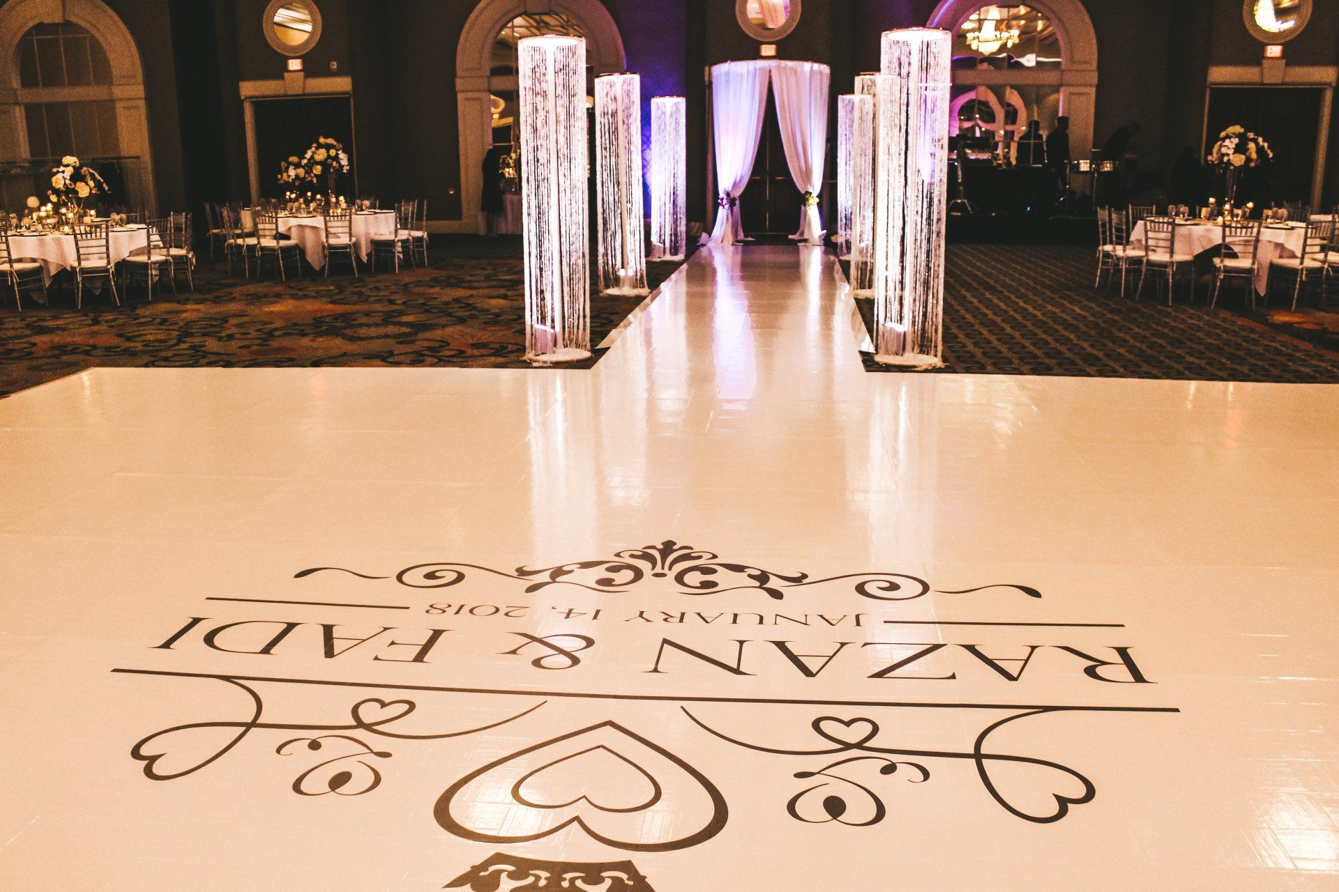 Make any dance floor look brand new again with vinyl covers. Our covers are specially designed for heavy foot traffic, so you can rest easy knowing the surface beneath will not show through. Take your event experience a step further with a custom print on your floor covering. Adding a custom design to your dance floor makes for many great photo opportunities with your guests. Place a design with initials or a monogram for an elegant touch. You can depend on us for elegant dance floor covers and excellent customer service during your event planning process.